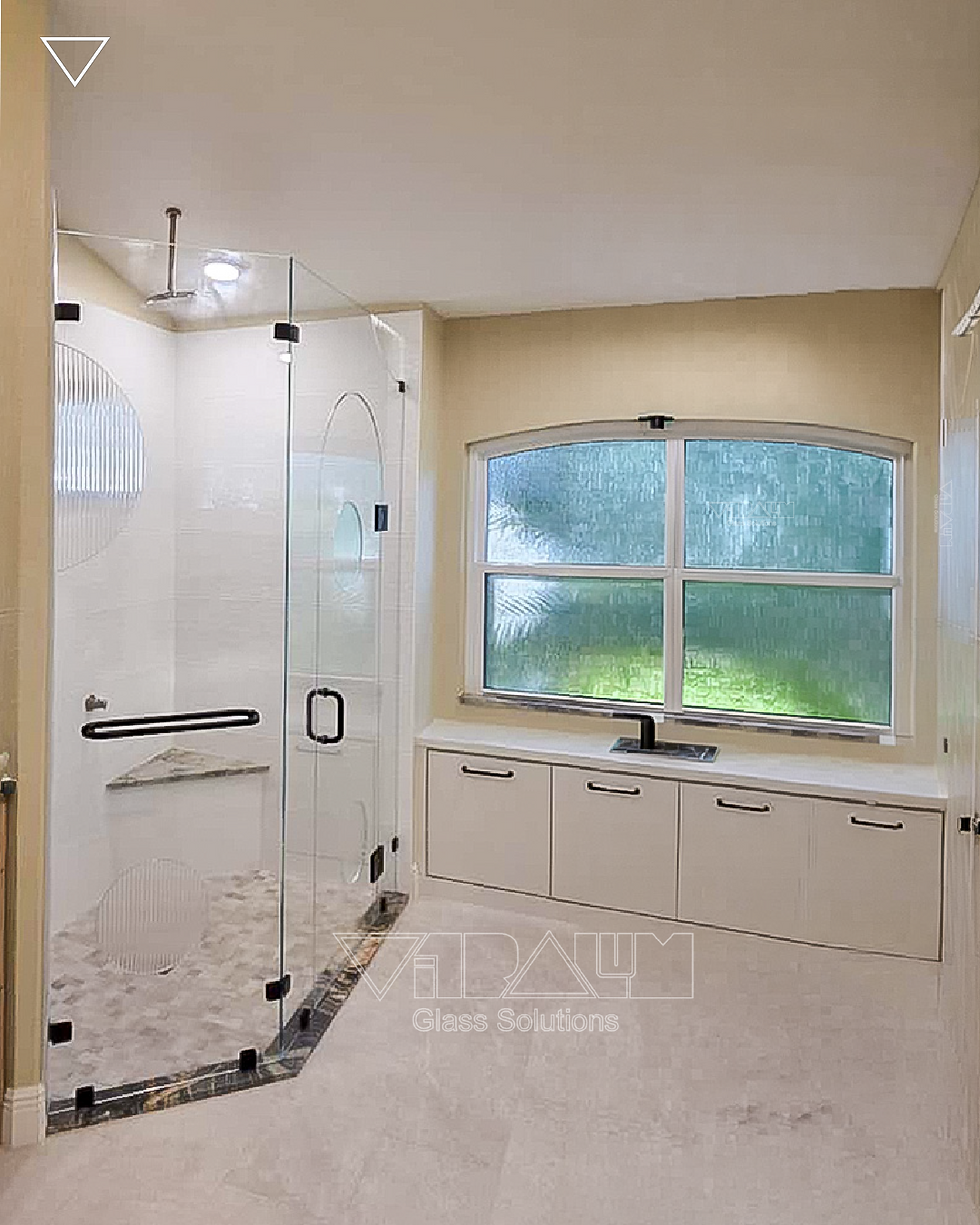 Old shower doors used to have a metal header on top, Vitralum Glass Solutions has designed a glass header